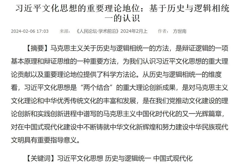 【编者按】2024年2月6日,《人民论坛·学术前沿》在线发文苏州大学东吴智库首席专家方世南教授的文章《习近平文化思想的重要理论地位:基于历史与逻辑相统一的认识》(网络首发)。文章强调,从历史与逻辑相统一的维度看,习近平文化思想是“两个结合”的重大理论创新成果,是对马克思主义文化理论和中华优秀传统文化的丰富和发展,是在我们党推动文化建设的理论创新和实践创新进程中谱写的马克思主义中国化时代化的又一光辉篇章,对在中国式现代化建设中不断铸就中华文化新辉煌和努力建设中华民族现代文明具有重要指导意义。现将全文转载如下,以飨读者。