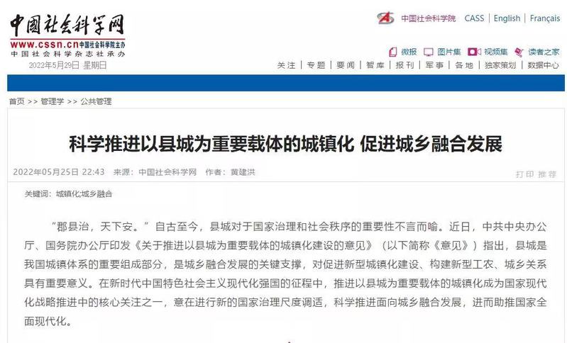 【编者按】近日,中国社会科学网刊登东吴智库研究员黄建洪教授的文章《科学推进以县城为重要载体的城镇化 促进城乡融合发展》。文章围绕国务院办公厅印发的《关于推进以县城为重要载体的城镇化建设的意见》,探讨了面向城乡融合发展,推进以县城为重要载体的城镇化建设的重要意义、突破的关键难点以及需要关注的重点方向。作者指出要更为深度地将新型城镇、乡村振兴战略衔接起来,以政府、市场与社会协力治理的方式来突破城镇化的深层约束,以新型城镇化治理结构、投资模式、开发方式、成本机制、参与方法来促进以县城为重要载体的城镇化的共建共治共享。现将全文转载如下,以飨读者。