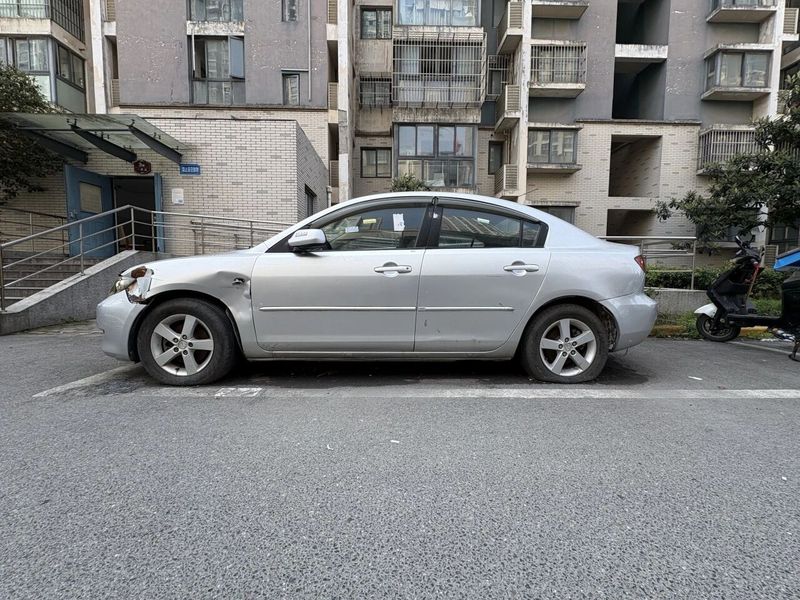 在车位极度紧张的情况下,数辆“僵尸车”却长期占据小区内公共车位,这些“钉子户”自然成为了业主们的“眼中钉”。例如小区3幢一单元楼下的一辆马自达占据离单元楼门口最近的黄金位置,却一停就是两年多。记者在现场看到,其车架多处破损,左侧车灯罩碎裂,四个轮胎已漏气干瘪,前挡风玻璃上张贴的年检标识显示为2023年。一旁便利店的店主刘女士告诉记者,两年多以来她从未见过车主来发动过车。