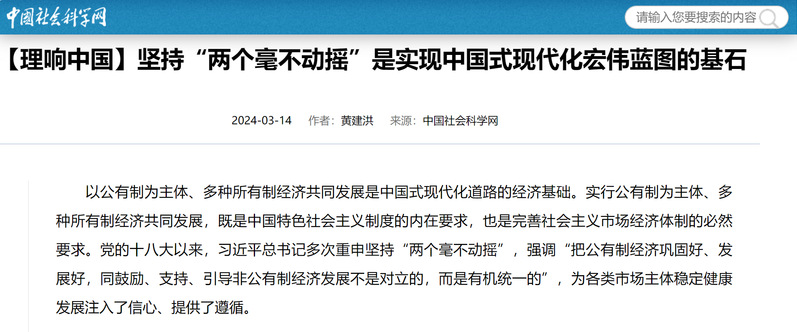 【编者按】3月14日,中国社会科学网刊登苏州大学东吴智库研究员黄建洪教授的文章《坚持“两个毫不动摇”是实现中国式现代化宏伟蓝图的基石》。文章表明,坚持“毫不动摇巩固和发展公有制经济”与“毫不动摇鼓励、支持、引导非公有制经济发展”对中国式现代化有重要意义,只有持续坚持“两个毫不动摇”,才能始终坚持和发展中国特色社会主义,进而推动实现中国式现代化道路的宏伟蓝图。现将全文转载如下,以飨读者。