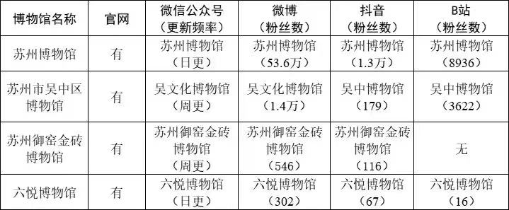 作为苏州市博物馆的总品牌,目前还停留在政府文件和中国新闻网、搜狐网等主流媒体报道中,外界知名度不太高。搜索发现,重庆、沈阳等城市也提出“百馆之城”的概念,与苏州“百馆之城”时常同屏出现,这不利于苏州抢占“百馆之城”品牌先机。借助对102家博物馆已有新媒体矩阵传播的考察,发现有以下五方面的问题。