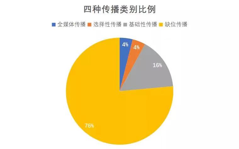 通过考察102家博物馆的新媒体矩阵,包括查阅新媒体账号情况、账号发文频率、开设栏目、内容呈现方式、粉丝数量和活跃度、新兴技术使用情况等。分析博物馆新媒体矩阵建设和传播现状,可分为全媒体传播(4%)、选择性媒体传播(4%)、基础性媒体传播(16%)和缺位传播(76%)等四种传播类别(详见图1)。