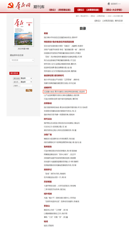 【编者按】近日,《群众》刊登苏州大学东吴智库执行院长段进军教授的文章《扛起重大使命 携手共建环太湖世界级创新湖区》。文章指出,在长三角区域一体化高质量发展背景下,沿太湖地区地缘邻近上海、经济发展迅猛、城镇化规模程度高,已经成为长三角“核心腹地”。为进一步建设环太湖世界级创新湖区,需要从顶层设计、科创平台、区域合作等方面将太湖得天独厚的生态优势转化为科创优势。现将全文转载如下,以飨读者。