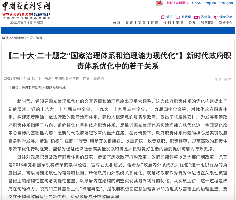 【编者按】近日,中国社会科学网刊登东吴智库研究员黄建洪教授的文章《新时代政府职责体系优化中的若干关系》。文章指出作为推进国家治理体系和治理能力现代化这一全面深化改革总目标的基础性内容,系统性优化重构政府职责体系,需要妥善处理好政府与市场、社会关系,处理好角色与职能、工具关系,处理好纵向与横向、跨域关系,处理好放权与监管、服务关系,处理好体系与能力、绩效关系,处理好人力、载体与技术关系,处理好法治、文化与发展关系。现将全文转载如下,以飨读者