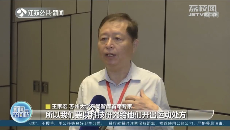 会后,王家宏教授接受了江苏广电总台江苏公共·新闻频道采访。他认为青少年和老年人是目前群众体育工作的重点,体育科技工作者要用科技研究给他们开出科学的运动处方,尤其是现在青少年的体育课,不仅要开好开足体育课,更要富有健康理念,让孩子们学会健身的本领,从而让他们在全生命周期,尽可能减少疾病。