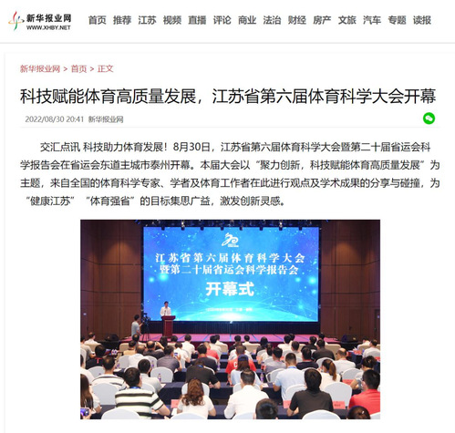 8月30日,江苏省第六届体育科学大会暨第二十届省运会科学报告会在泰州召开。国家体育总局体育科学研究所所长曹景伟、江苏省体育局局长陈少军、江苏省体育局副局长刘彤、苏州大学东吴智库首席专家王家宏以及来自省体育局、省体育科学学会、省内各高校和各市体育科学研究所的嘉宾、代表参加了此次大会。本届大会以“聚力创新,科技赋能体育高质量发展”为主题,旨在激励广大体育科技工作者进一步开拓思路、大胆求索,以创新成果赋能体育高质量发展,为健康江苏、体育强省建设提供强有力的科学引领与科技支撑。