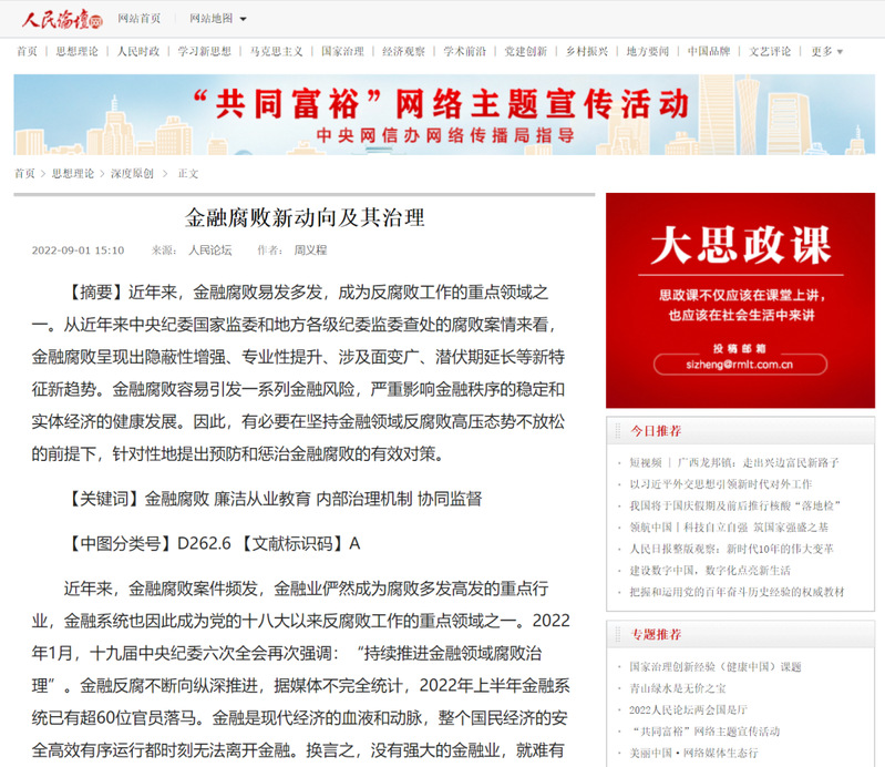 【编者按】近日,人民论坛网刊登苏州大学东吴智库政府治理研究中心主任周义程教授的文章《金融腐败新动向及其治理》。文章在厘清我国金融腐败基本类型的基础上,深入探讨金融腐败的新特征新趋势、多重成因和治理对策。现将全文转载如下,以飨读者。