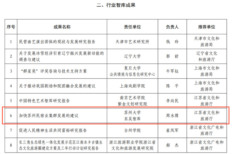 近日,文化和旅游部公布了《文化和旅游部社科研究优秀成果推介展示活动(2021—2023)名单》。经评议和公示,共确定优秀科研项目成果15项,优秀行业智库成果25个,优秀期刊专题10个。苏州大学东吴智库副院长、文旅融合发展研究中心主任周永博教授的研究成果《加快苏州民宿业集群发展的建议》入选优秀行业智库成果。