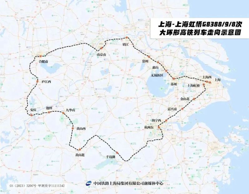 2024年4月26日,长三角地区铁路新线——池黄高铁开通运营。得益于此,长三角铁路首次尝试开行上海-上海虹桥G8388/9/8次大环形高铁列车。串联3省1市21座车站,单向行驶里程超过1200公里。这条超级大环线将长三角连成一个“圈”。