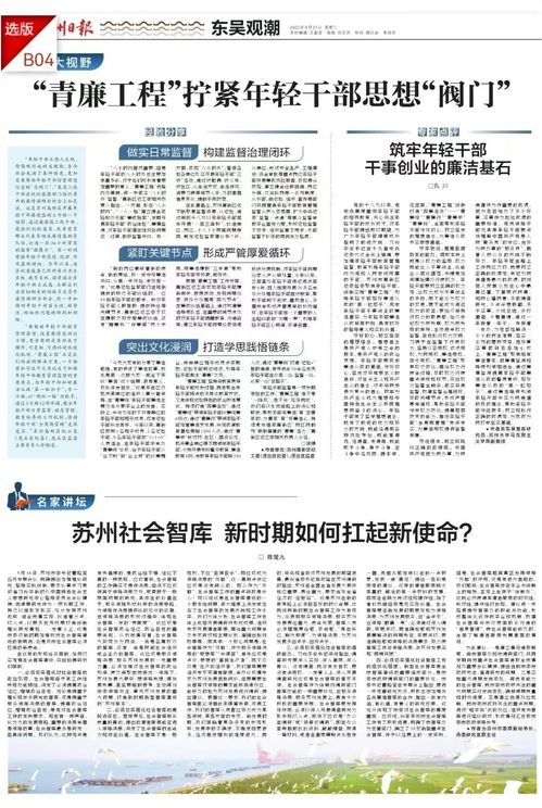 【编者按】近日,《苏州日报》刊登了苏州大学东吴智库研究员孔川副教授的文章《筑牢年轻干部干事创业的廉洁基石》。文章聚焦苏州市高新区的“清廉工程”,从理想信念、拒腐防变、政绩观三个角度进行了深入分析。现将全文转载如下,以飨读者。