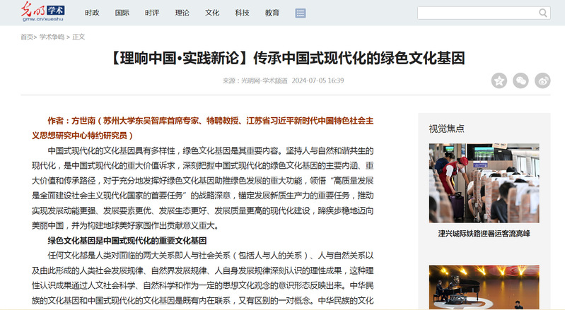 【编者按】2024年7月5日,光明网发表了苏州大学东吴智库首席专家方世南教授的文章《传承中国式现代化的绿色文化基因》。文章阐述了绿色文化基因是中国式现代化的重要文化基因,是助推中国式现代化的强大精神力量以及中国式现代化的绿色文化基因的传承路径。现将全文转载如下,以飨读者。