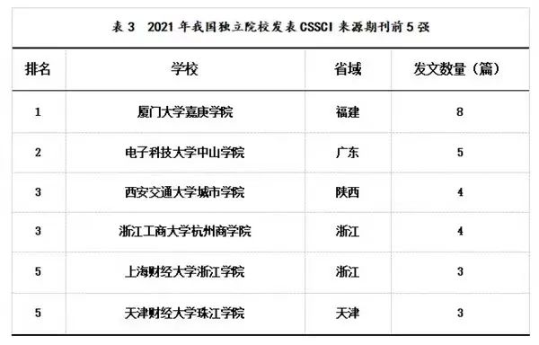此外,还有11所独立学院在CSSCI来源期刊发文。虽然我国独立学院的整体科研竞争力因部分高水平的独立学院(如浙江大学宁波理工学院和浙江大学城市学院)转设而有所下降,但总体看来,独立学院仍在不断增强自身的科研建设,努力提高科学研究水平。