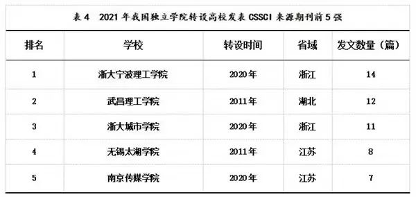 自转设以来,武昌理工学院(原武汉科技大学中南分校)、浙大城市学院(原浙江大学城市学院)、无锡太湖学院(原江南大学太湖学院)、南京传媒学院(原中国传媒大学南广学院)4所院校也表现优异,在CSSCI来源期刊的发文量分别为12、11、8、7篇,在转设高校中分别位于第2、3、4、5名。