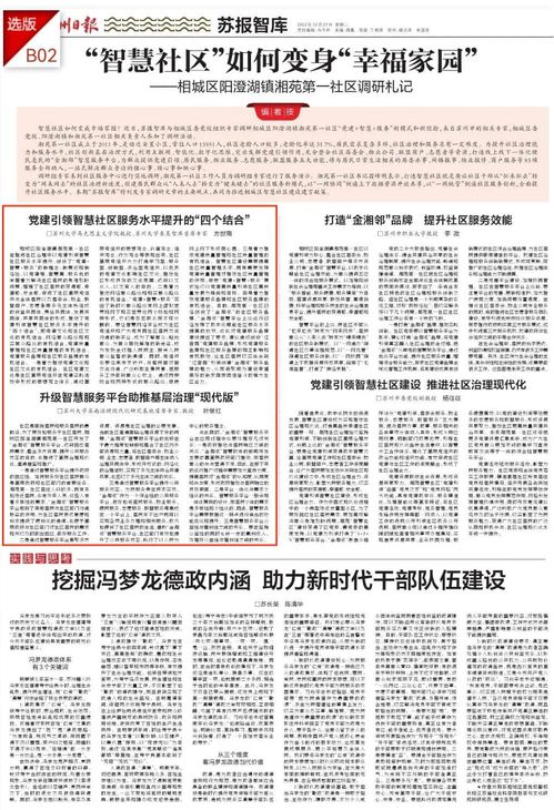 智慧社区如何变成幸福家园?近日,苏报智库与相城区委党校组织专家调研相城区阳澄湖镇湘苑第一社区“党建+智慧+服务”新模式和新经验,来自苏州市的相关专家,相城区委党校、阳澄湖镇和湘苑第一社区相关负责人参加了调研活动。