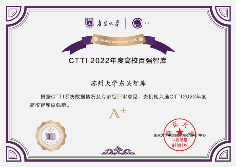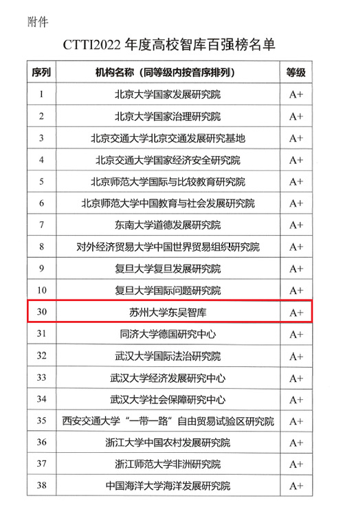 近日,南京大学中国智库研究与评价中心发布了2022年CTTI来源智库增补名单、优秀成果和高校智库百强榜。苏州大学东吴智库获评CTTI 2022年度高校百强智库A+等级。这是东吴智库继入选CTTI 2018年度高校智库百强榜并获评A等级后,再次入围高校智库百强榜并提升至最高等级。