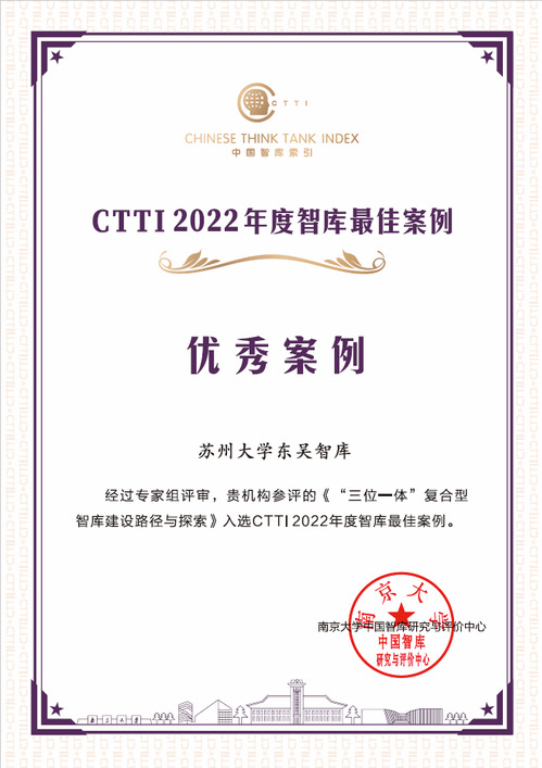 此外,在CTTI 2022年度智库最佳案例和智库优秀成果评选中,苏州大学东吴智库报送的《“三位一体”复合型智库建设路径与探索》获评CTTI 2022年度智库最佳案例优秀案例,报送的《关于地方立法存泛政策化倾向的观点》《以空间结构战略调整推动市域一体化的建议》分别获评CTTI 2022年度智库优秀成果特等奖、一等奖。