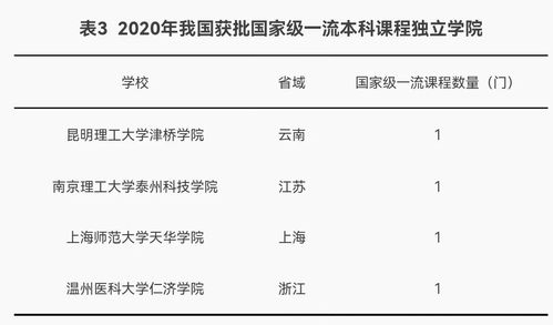 表3列出了2020年获批国家级一流本科课程的4所独立学院,均获批1门国家级一流本科课程。这4所独立学院分别是昆明理工大学津桥学院(获批的国家级一流本科课程为BIM装配式建筑概论)、南京理工大学泰州科技学院(获批的国家级一流本科课程为Java程序设计)、上海师范大学天华学院(获批的国家级一流本科课程为早期阅读与指导)和温州医科大学仁济学院(获批的国家级一流本科课程为医学伦理学)。除昆明理工大学津桥学院来自西部地区外,其余3所独立学院均来自东部地区。