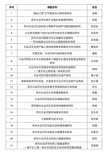 经个人申报、单位推荐、专家评审,现将2019年度大运河文化带建设研究院苏州分院、苏州大运河文化带建设研究院招标课题立项结果公布如下: