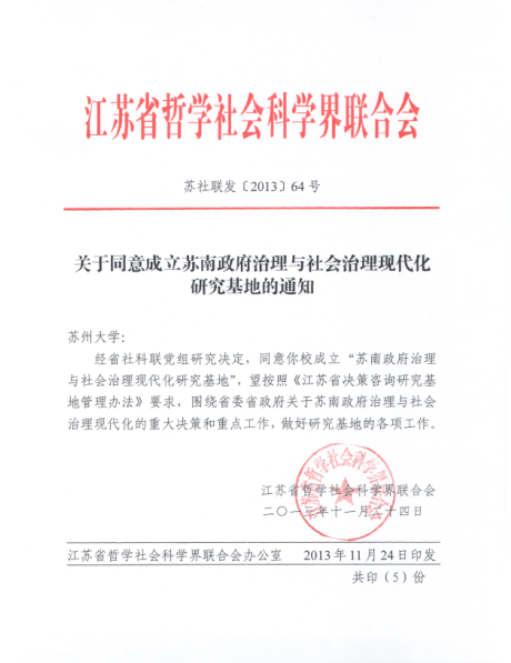 苏州大学落实党的十八届三中全会的重要决定,紧紧围绕国家战略的实施,抢抓机遇、主动对接、全面融入,推动苏南政府治理体系在服务地方经济社会发展大局中创新发展,适时地申报了“苏南政府治理与社会治理现代化研究基地”,并被江苏省社科联批准立项。