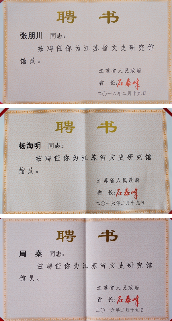 东吴智库研究员张朋川、杨海明、周秦教授受聘江苏省文史研究馆馆员