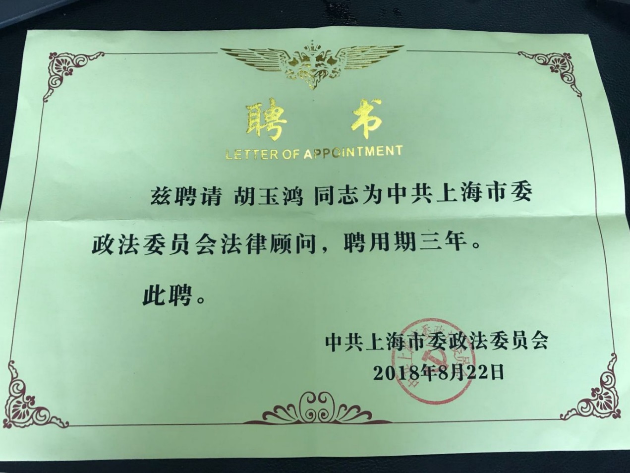 东吴智库首席专家胡玉鸿教授受聘为中共上海市委政法委员会法律顾问