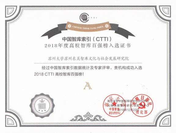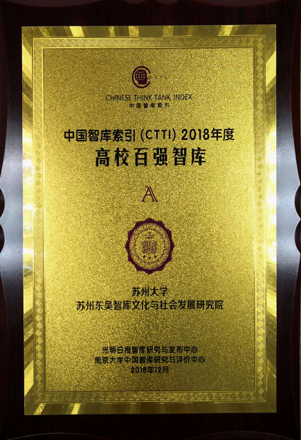 12月22日,2018中国智库治理暨思想理论传播高峰论坛在南京举行。本次论坛以“智库建设:助力改革开放与高质量发展”为主题,中央及各省市思想理论和智库管理部门领导、中央重点高校科研管理部门领导、中国智库索引(CTTI)来源智库、智库研究界著名专家学者、主流媒体等各界代表与会交流。会上发布了“2018年CTTI高校智库百强榜”,我校东吴智库入选并被评定为“A”。