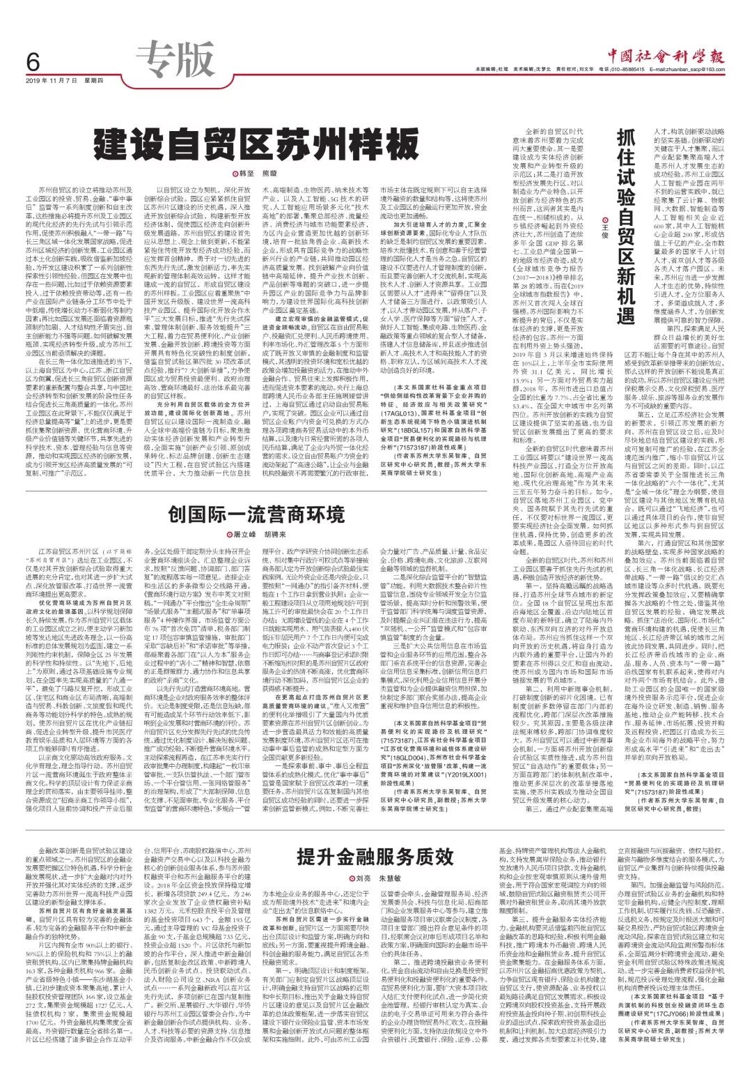 2019年11月7日,《中国社会科学报》第6版专版刊登了东吴智库研究成果,王俊、韩坚、屠立峰和刘亮四位研究员就“苏州自贸片区建设”这一主题发表观点。