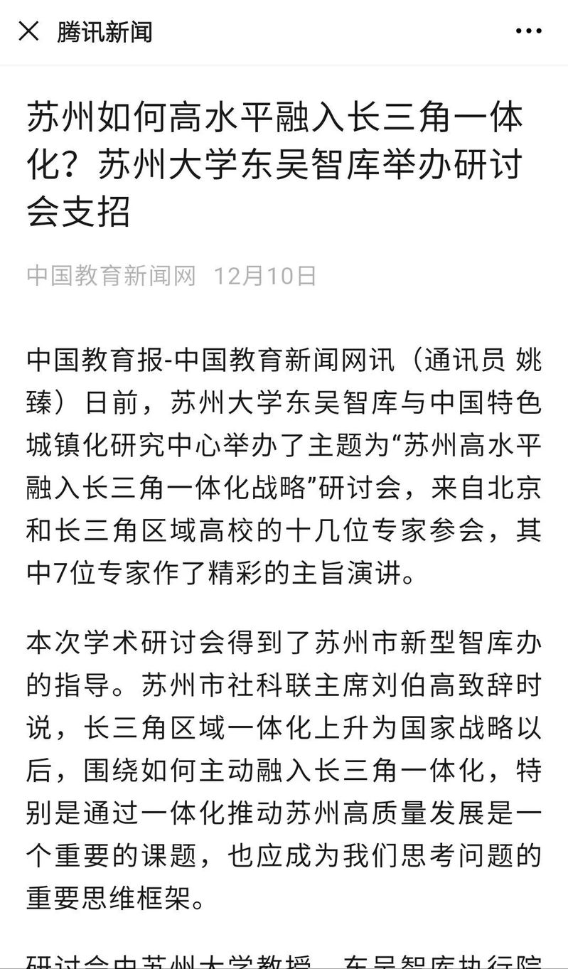 苏州日报:《高水平融入长三角一体化的“苏州战略”——苏州大学东吴智库研讨会上的专家演讲内容摘要》