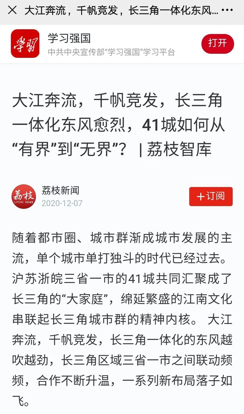 荔枝网:《大江奔流,千帆竞发,长三角一体化东风愈烈,41城如何从“有界”到“无界”?| 荔枝智库》