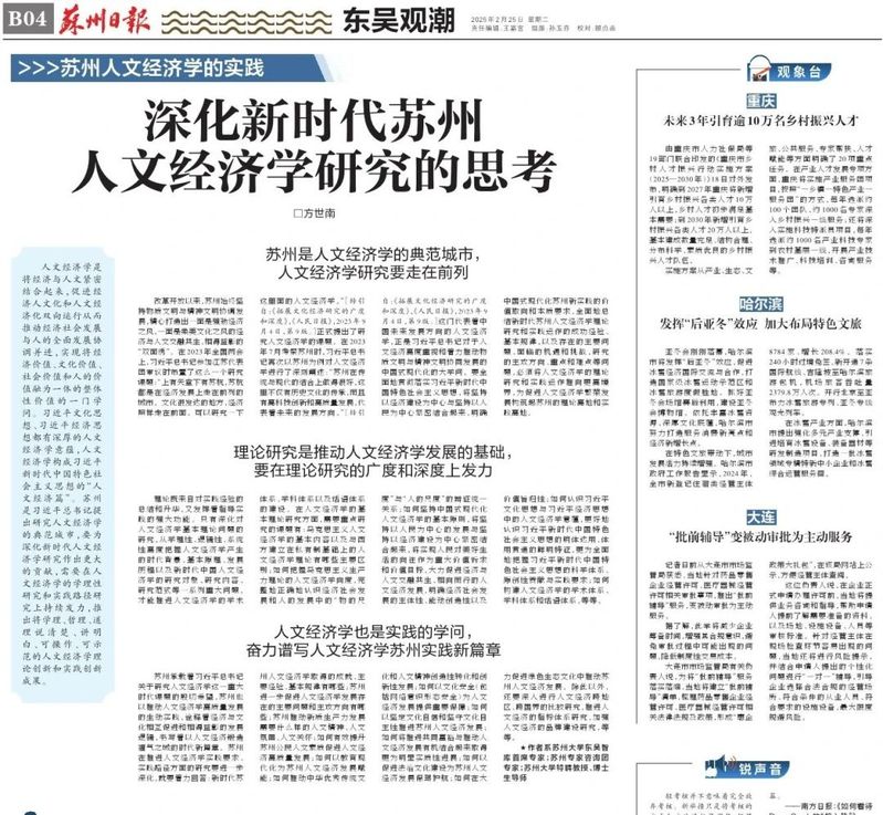【编者按】近日,《苏州日报》刊登苏州大学东吴智库首席专家方世南的文章《深化新时代苏州人文经济学研究的思考》,从专家视角阐明苏州应如何有效推进人文经济学高质量发展。现将全文转载如下,以飨读者。