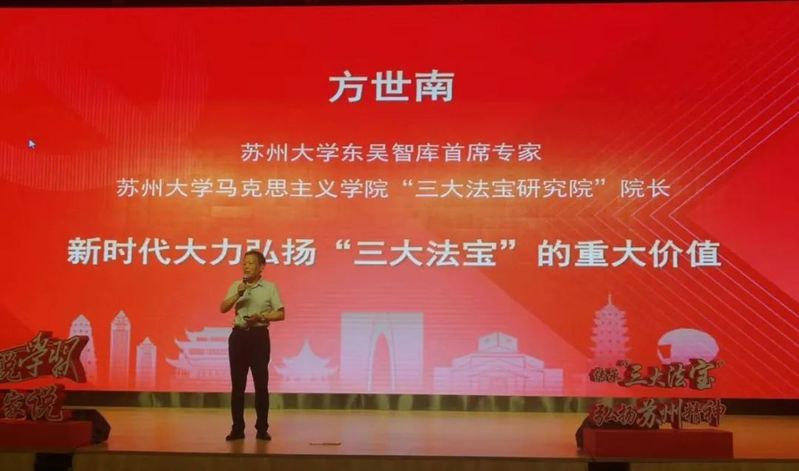 8月7日,苏州大学东吴智库首席专家、苏州大学马克思主义学院“三大法宝研究院”院长方世南教授担纲由苏州市委宣传部、苏州市社科联主办,苏州日报社承办的“众说学习·名家说——传承‘三大法宝’ 弘扬新时代苏州精神”系列活动的首场主讲嘉宾。在本次活动中,方世南教授以《新时代大力弘扬“三大法宝”的重大价值》为主题作了专题讲座。