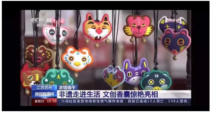 2021年端午,苏州大学艺术学院杨文丹老师设计团队应苏州市非物质文化遗产保护管理办公室邀请,为苏州非遗项目量身设计香囊外观,旨在提升非遗文创产品的设计水平,擦亮江南文化品牌。相关成果被中央电视台新闻频道报道。