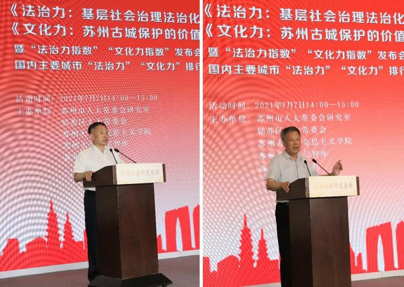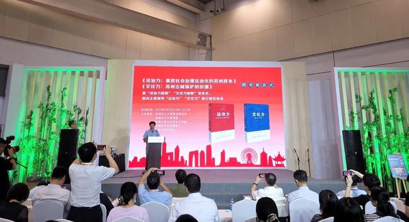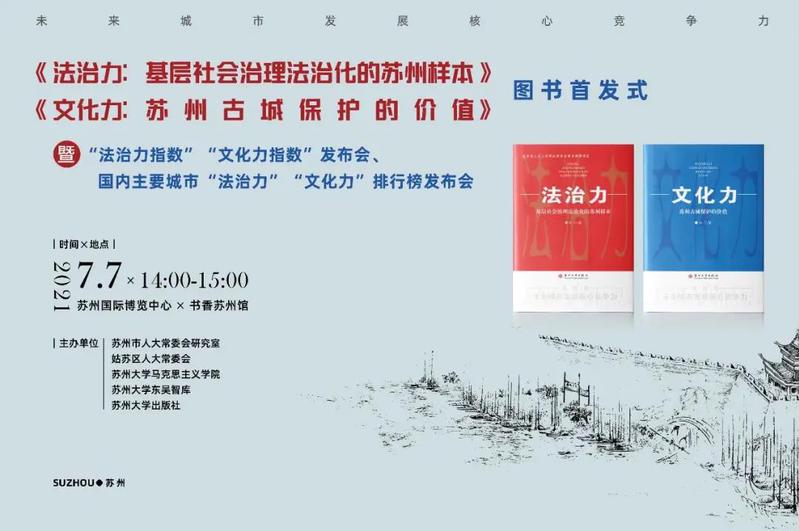 7月7日下午,在第十一届江苏书展上,苏州大学东吴智库发布“法治力指数”、“文化力指数”和中国100个主要城市“法治力”、“文化力”排行榜,举行了《法治力:基层社会治理法治化的苏州样本》《文化力:苏州古城保护的价值》新书首发。该成果由苏州大学东吴智库与苏州市人大常委会研究室共同打造,由苏州大学出版社出版。发布会上,苏州市人大常委会副主任缪红梅、姑苏区人大常委会主任郦小萍、苏州市人大常委会研究室主任李远延,苏州大学人文社科处处长于毓蓝、出版社社长盛惠良、马克思主义学院院长田芝健,东吴智库首席专家方世南、执行院长段进军、研究员陈一、屠立峰、徐蒙等学者出席会议。
